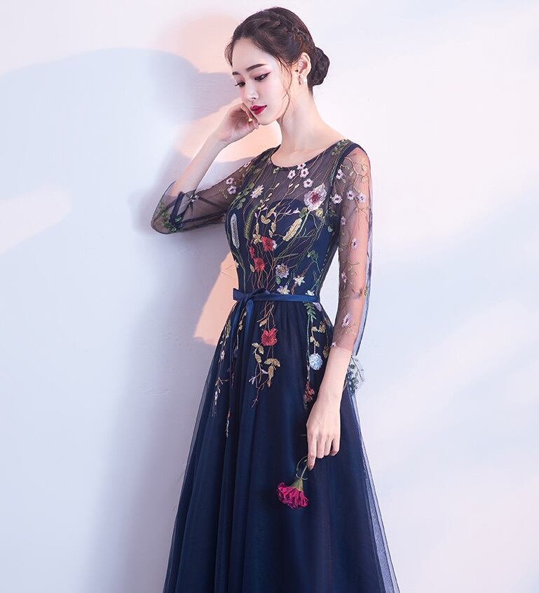 ロング丈 花柄刺繍 ネイビーワンピース ドレス 披露宴 二次会 同窓会 パーティー お呼ばれ 結婚式 謝恩会 演奏会 式典 コンサート DUOX0045 | 2019新作ドレス★onlythebestオンリーザベスト