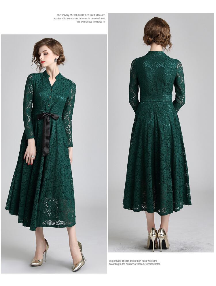 レース 刺繍 Ⅴネック マキシ丈 リボンベルト 長袖 スタンドカラー ドレス ワンピース 結婚式 二次会 パーティー ディナー 女子会 卒業式 謝恩会 コンサート