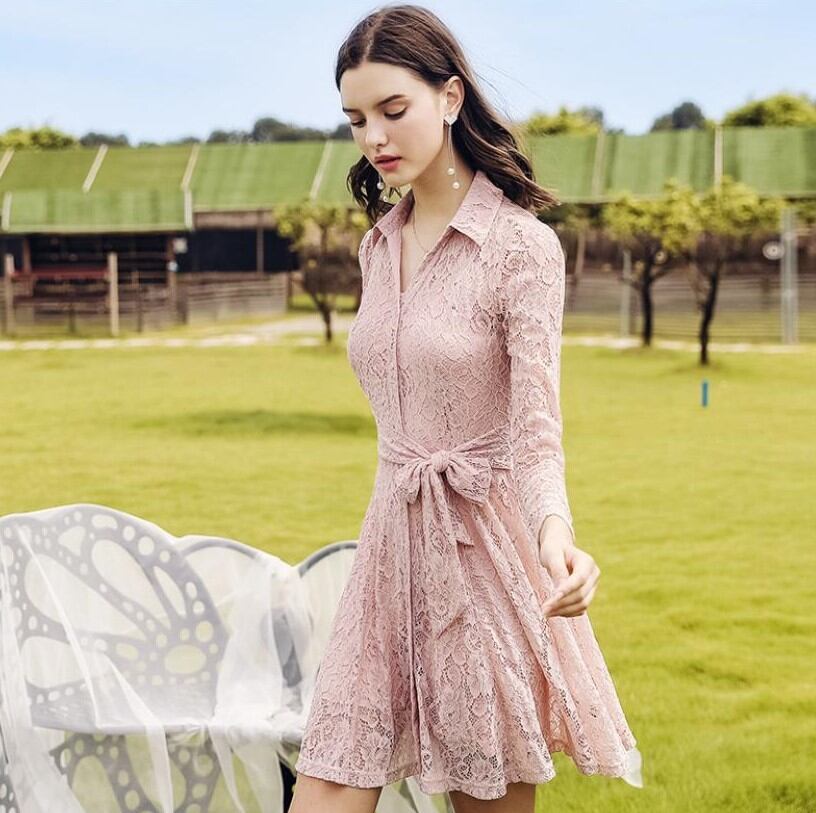 ・キーワード:おしゃれ レース ミディアム丈 ピンク ドレス 透け感 2018年秋トレンド ワンピース