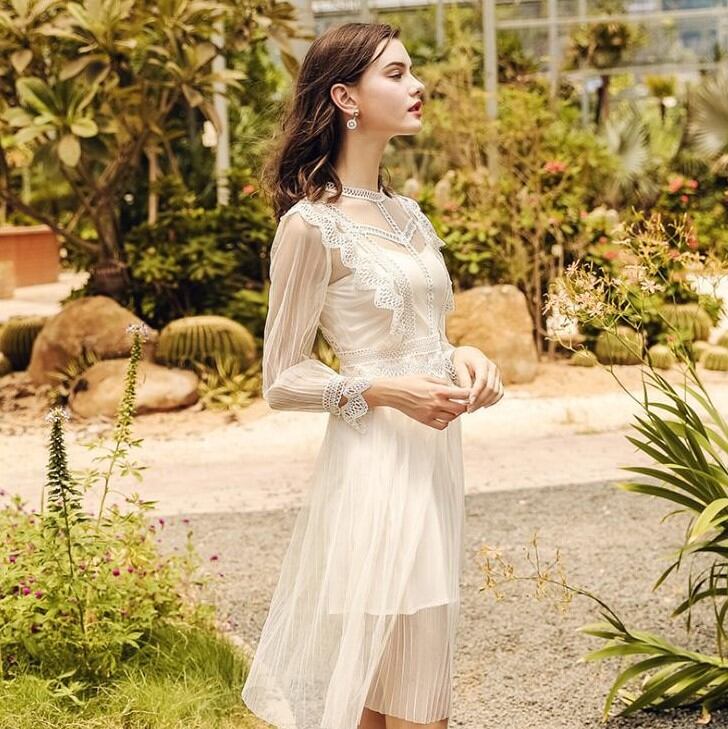 ・キーワード:シフォン セクシー レース ミディアム丈 おしゃれ 2018年秋トレンド 長袖 ドレス ワンピース