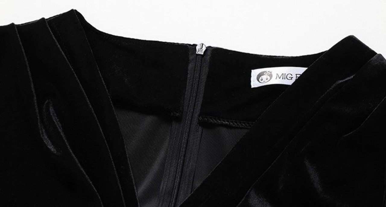 深いVネックデコルテをきれいに見せられ、スカートの裾は太ももまで開け、セクシーの雰囲気に。