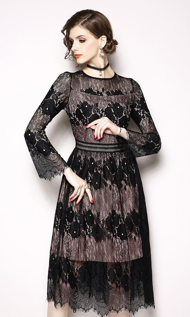 #ブラックレース#華やか#結婚式#二次会#パーティー#セクシー#披露宴#膝丈#七分袖