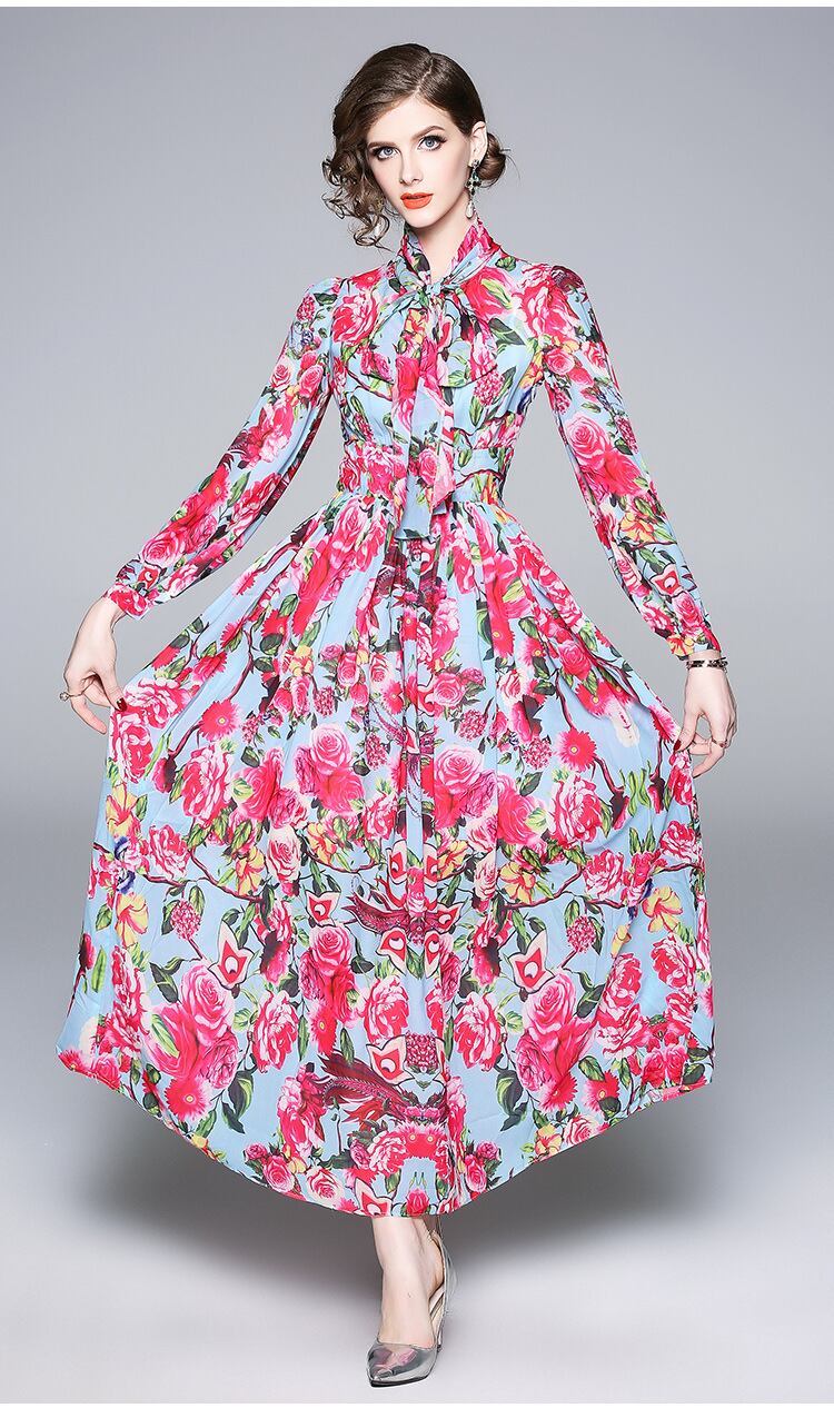 花柄 プリント マキシ丈 ロング 長袖 リボン ワンピース パーティー 買い物 食事会 通勤 女子会 ディナー デート 長袖 秋 秋冬 レトロ フィットアンド 通勤 着痩せ効果 ヨーロッパ風