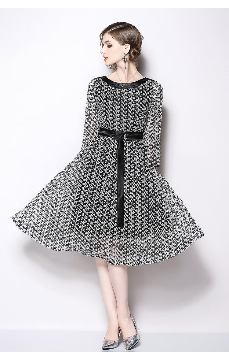 刺繍 モノトーン 七分丈 膝下 ワンピース ドレス 結婚式 二次会 パーティー デート 女子会 食事会 通勤 秋 秋夏 30代 40代 50代 足長効果 ピップカバー ヨーロッパ風 L XL XXL XXL