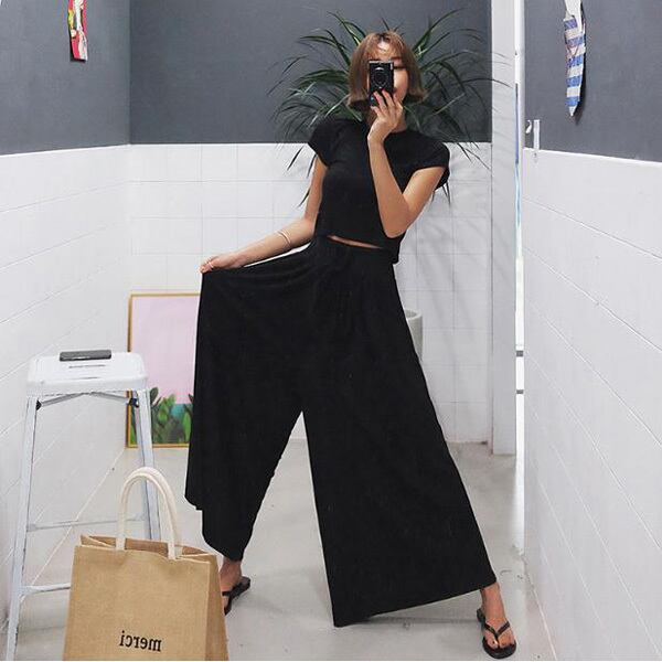 セットアップ Tシャツ フレアパンツ ワイドパンツ ウエストゴム 半袖カットソー ロングパンツ クール シンプル カジュアル ボーイッシュ ラフ マニッシュ デイリー 普段使い ショッピング デート 女子会 アウトドア 韓国 ノーブランド ゆるやか