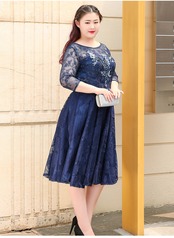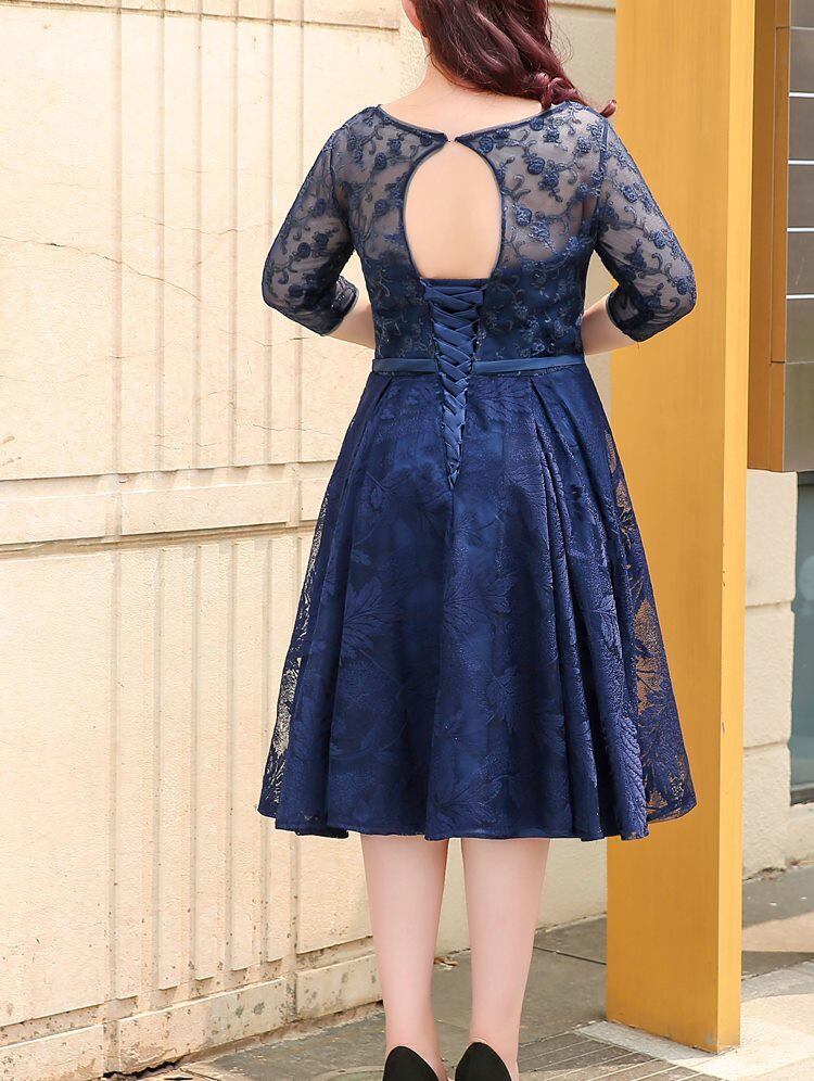 レース 刺繍 大きいサイズ 膝丈 七分丈 スパンコールドレス パーティードレス パーティー フレア 足長効果 結婚式 披露宴 二次会 ステージ 司会者 演奏会 コンサート お呼ばれ 春 夏 秋 冬 L XL 2XL 3XL 4XLスピンドル レースアップ