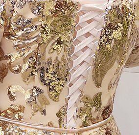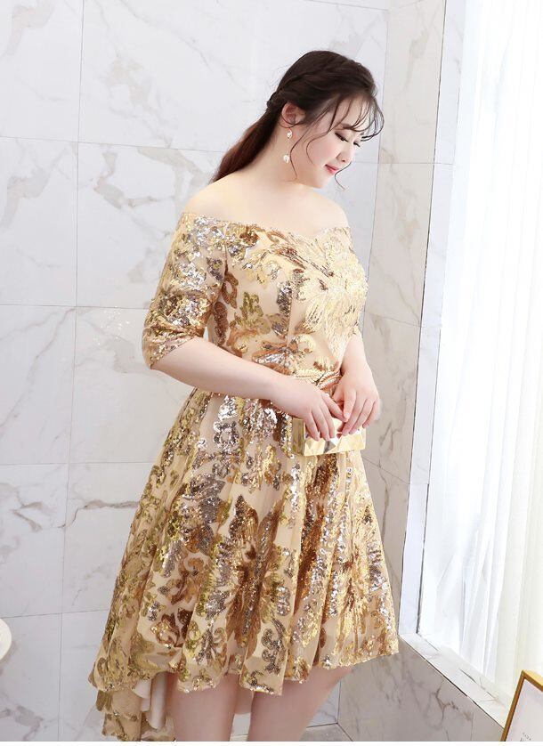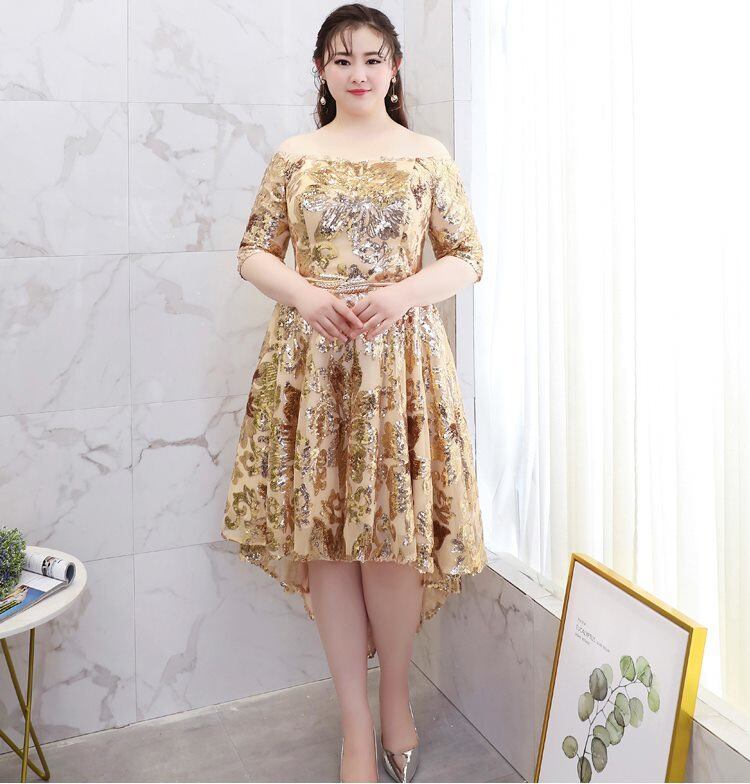 オフショルダー ビーズ刺繍 きらきら フィッシュテール 七分丈 スパンコールドレス パーティードレス パーティー 結婚式 披露宴 二次会 ステージ 司会者 コンサート 演奏会 大きいサイズ 調節できる 足細効果 フレア ゴールド 2XL 3XL 4XL 5XL 6XLスピンドル レースアップ