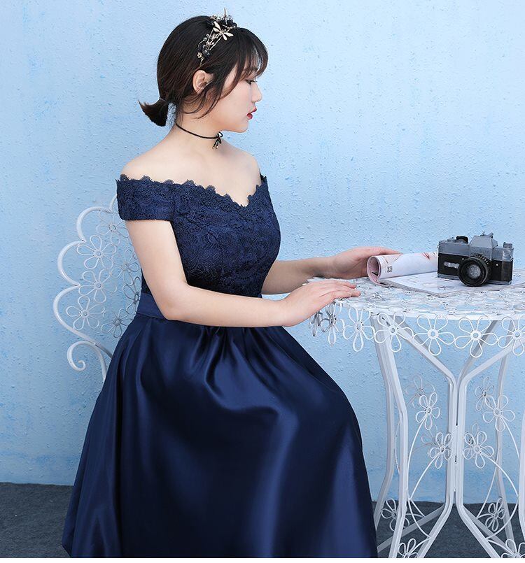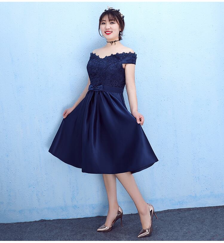 オフショルダー 刺繍 リボン 膝丈 パーティードレス 結婚式 披露宴 二次会 ステージ パーティー 演奏会 コンサート 発表会 ネイビー 大きいサイズ 体型カバー 調節可能 着痩せ XL 2XL 3XL 4XL 5XL 足長効果 キャバ お呼ばれ スピンドル レースアップ