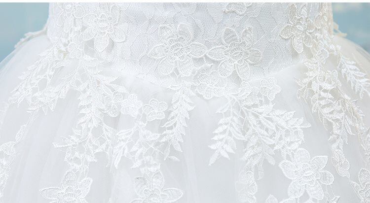 トップスに刺繍を施したかわいいオフショルダーウエディングドレスです。