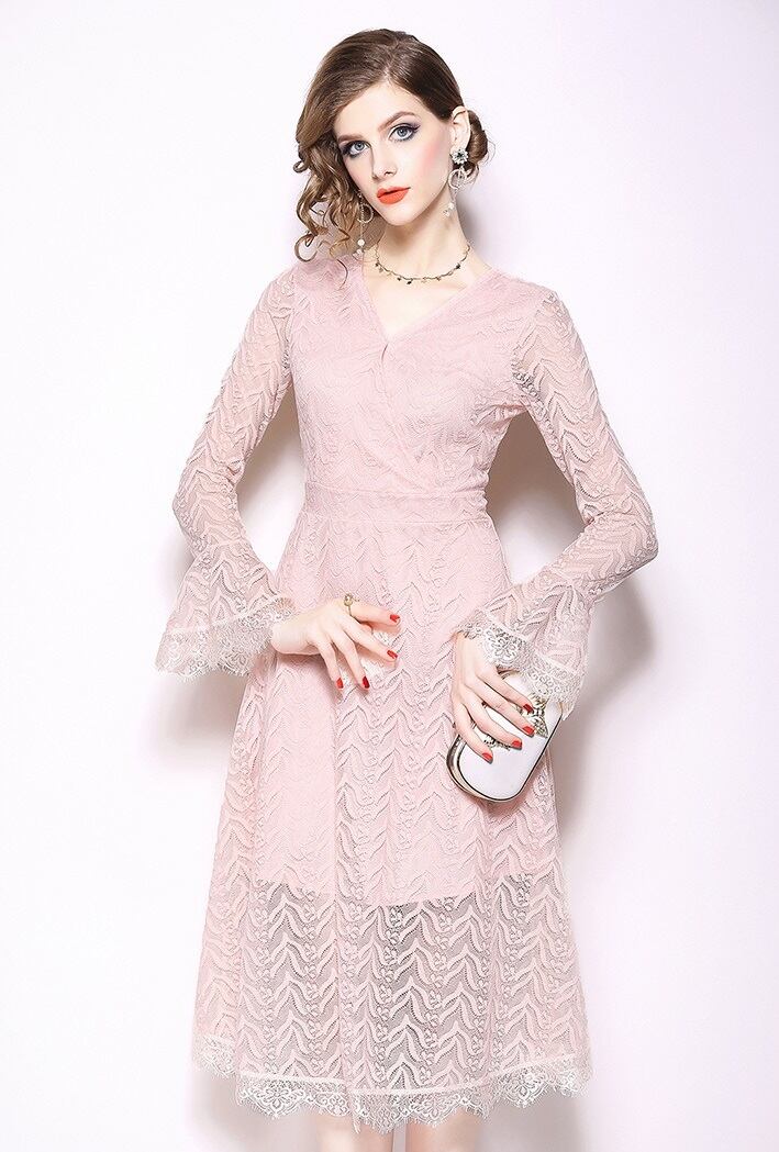 (aixi_X0045) レース パーティードレス ミモレ丈 袖あり 結婚式 ドレス お呼ばれ ワンピース 30代 20代 40代 披露宴 二次会 フォーマル ピンク | 2019新作ドレス★onlythebestオンリーザベスト