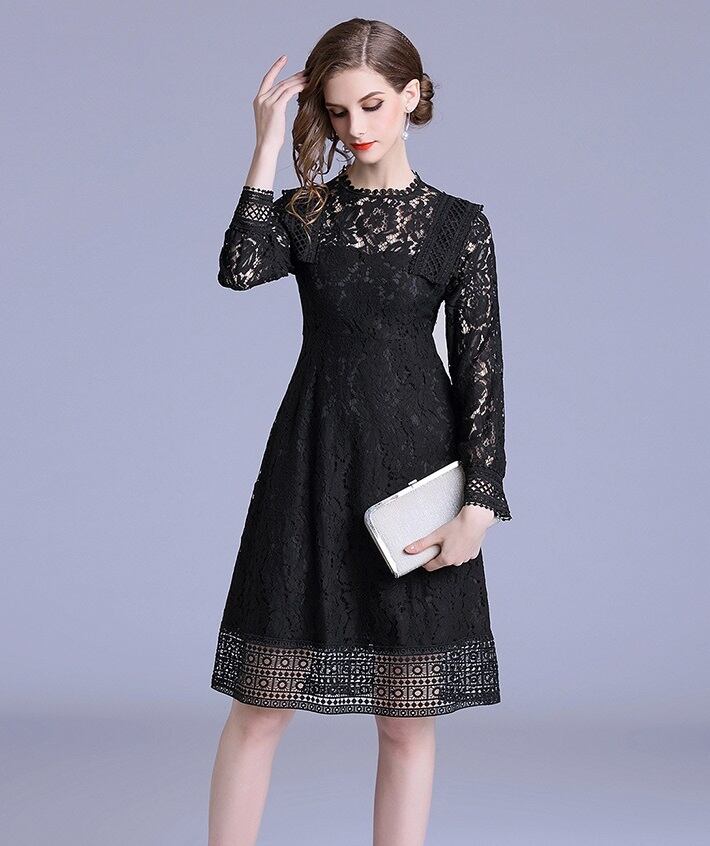 パーティーやお呼ばれにも使える、膝丈レースワンピースです。