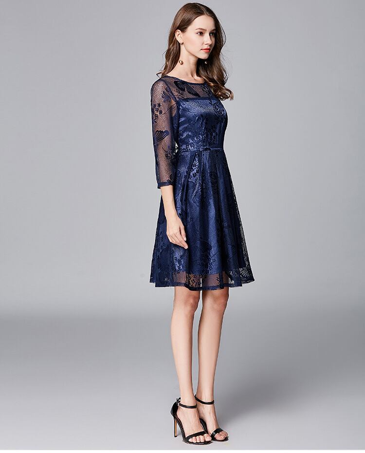 レース 刺繍 膝丈 フレア ネイビー 七分丈 パーティードレス 結婚式 二次会 披露宴 女子会 パーティー ディナー デート 演奏会 コンサート 発表会 お呼ばれ 親族 大きいサイズ 体型カバー 足長効果 春 秋 冬 2L 3L 4L 5L 6L