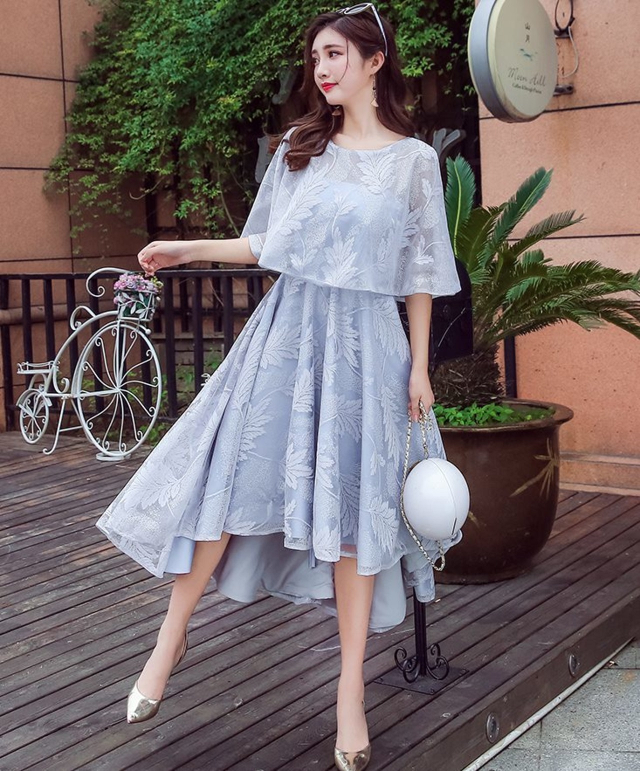 ケープ風とレースの仕上げのフレアシルエットワンピース。