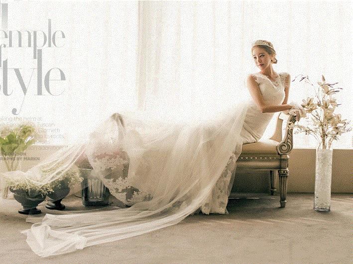 ヴェールのようなロングのトレーンがエレガントなウエディングドレスです。