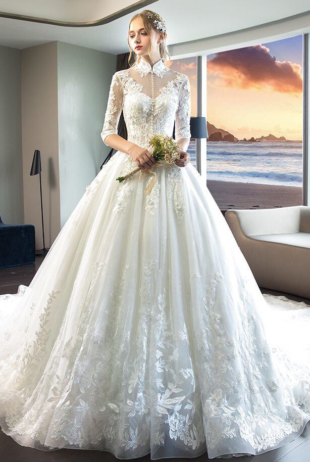 (twdgdrsbig-x0023) スタンドカラー 七分丈 刺繍 レース チュール Aライン ロング ウェディングドレス 白 二次会 花嫁 ウェディングドレス 袖あり | 2019新作ドレス★onlythebestオンリーザベスト
