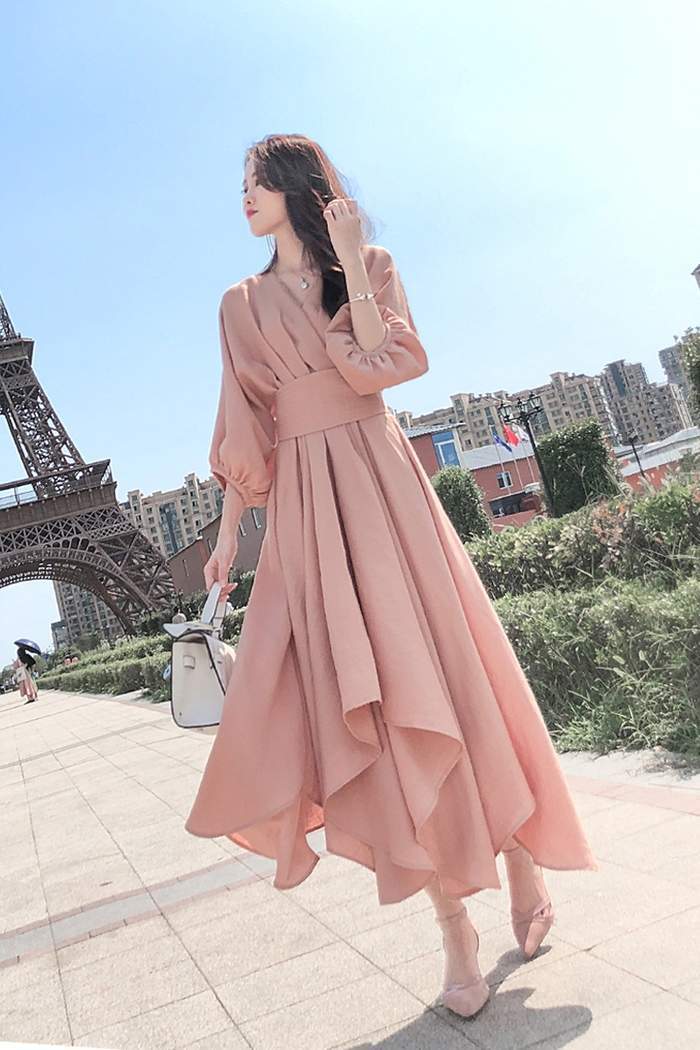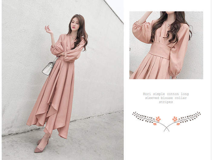 (cest-X0009) 女性の服 Vネック ワンピース 2018年秋トレンド ピンク ロングワンピース シャツワンピース ロング丈 格安 | 2019新作ドレス★onlythebestオンリーザベスト