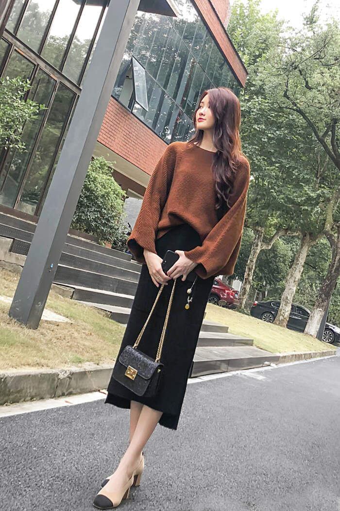 スーツ 女性の服 セーター スカート ツーピーススーツ ブラウンとブラック 2018年秋トレンド
