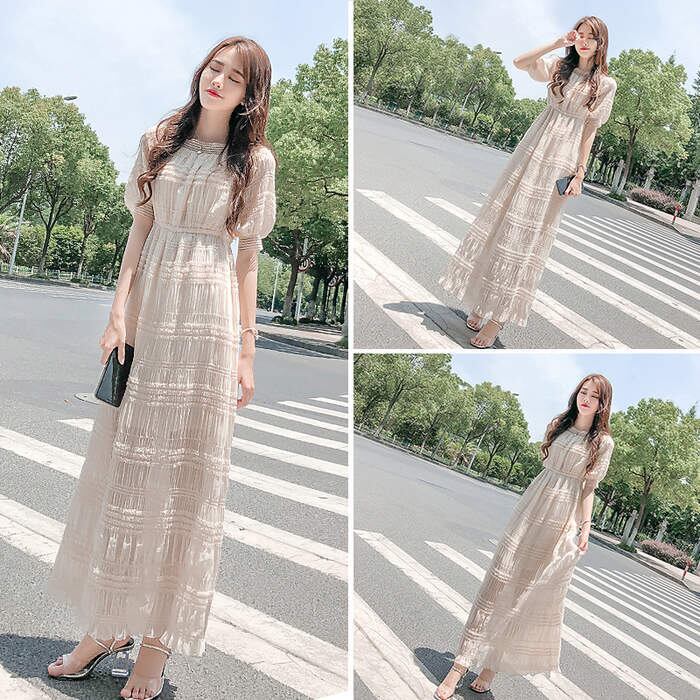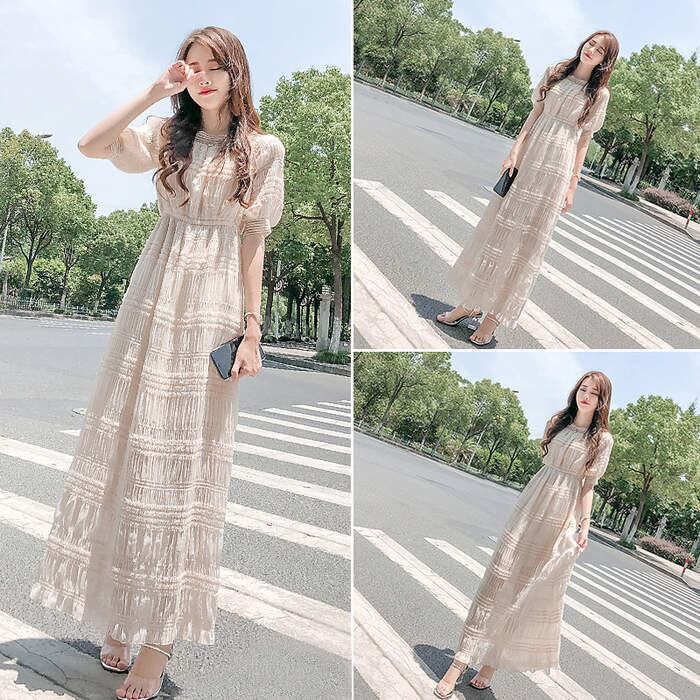 女性の服 五分袖 シフォン ベージュ ロングワンピース