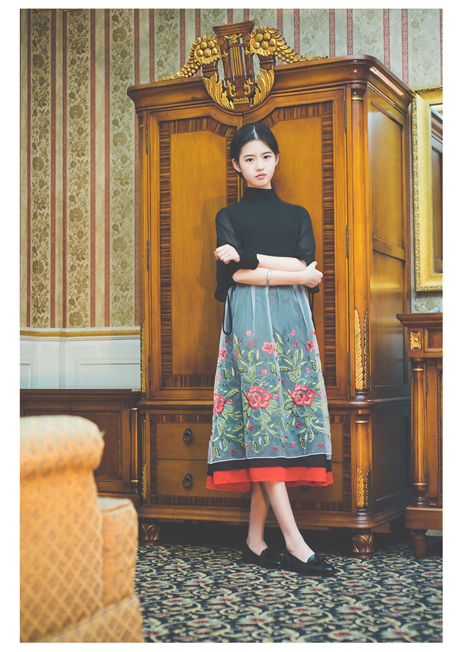 透け感のシフォンオーガンジー素材で、黒の上に重ねたお花の刺繍や裾のラインがレトロかわいいコンビネーションワンピースです。