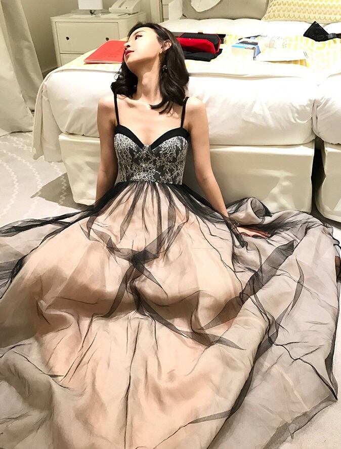 セクシーでエレガントなレディー風ストラップレースビスチェロングドレス。