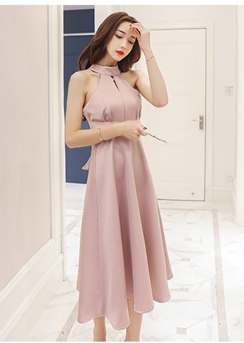 エレガントで綺麗目♪ホルターネックのハイウエストミディアム丈ピンクワンピース