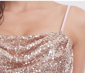 胸元のドレープ、大きくあいた背中のデザイン、細い肩ストラップでヌーディーでラグジュアリーな雰囲気のロングドレスです。全体3mmの細かいスパンコールでおおわれ、ステージの上などライトの下では極上の輝きを放ちます。