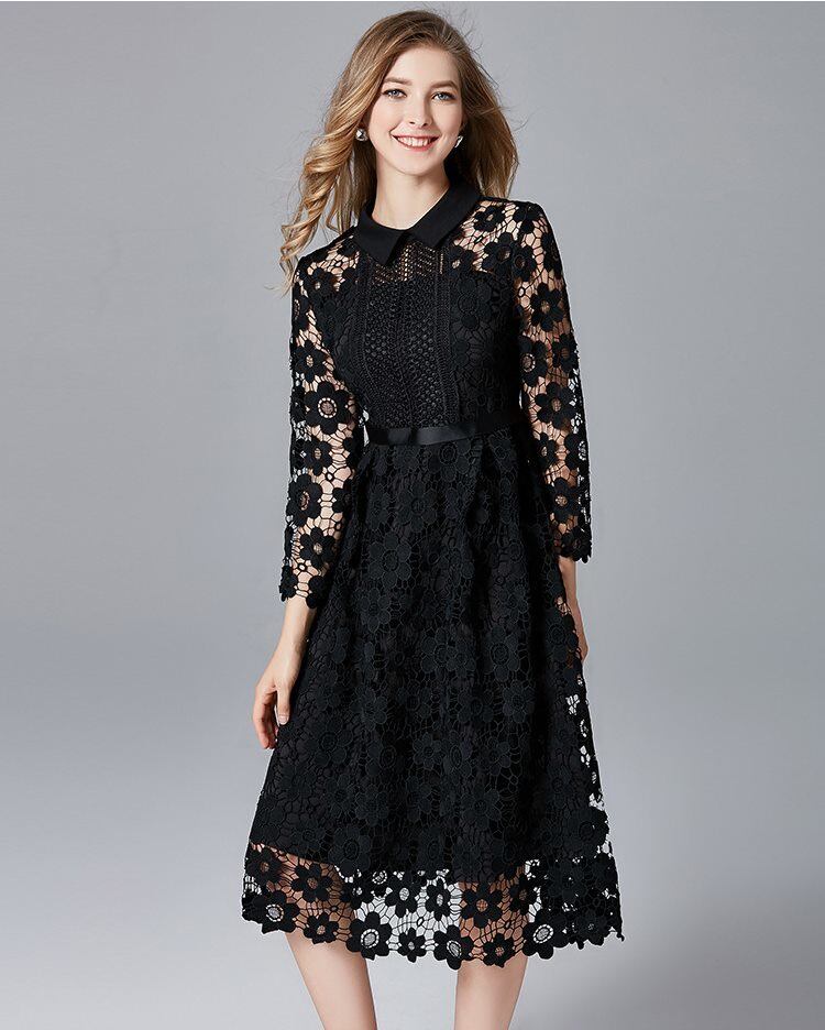 花柄レース 刺繍 襟付き 長袖 ワンピース パーティードレス 結婚式 二次会 披露宴 パーティー デート 女子会 食事会 卒業式 謝恩会 親族 お呼ばれ フォーマル 演奏会 コンサート 発表会 膝下 大きいサイズ L 2L 3L 4L 5L 黒 フレア