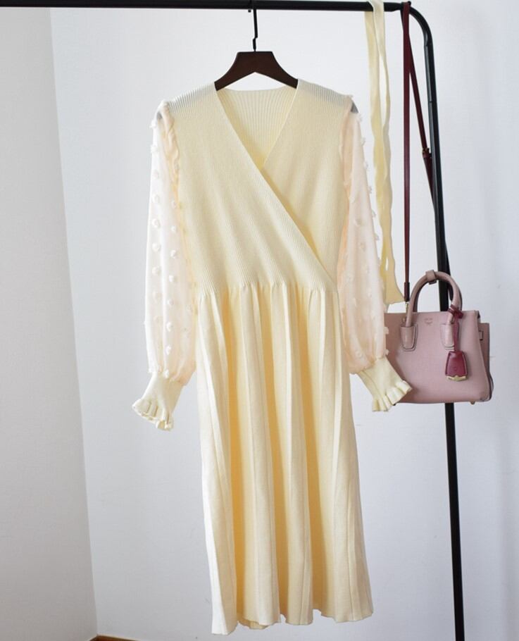 ワンピース 刺繍袖 リボン プリーツ エレガント スタイリッシュ マタニティ スリム ドレス ワンサイズ