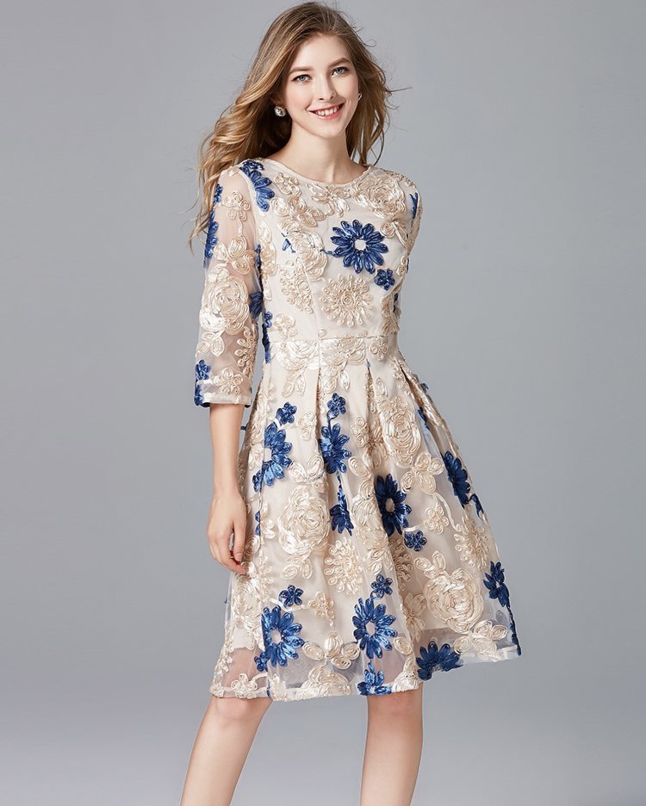 ゴールドの3Dの花刺繍を施したフレアのワンピースに青色の花も混ぜて、華やかさをアップ。
