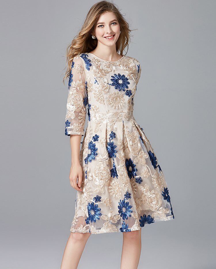 (yizhuai-x0013) 3D花刺繍 レース フレア 七分丈袖 膝丈 ワンピース ドレス 結婚式 二次会 披露宴 パーティー お呼ばれ 卒業式 発表会 親族 大きいサイズ | 2019新作ドレス★onlythebestオンリーザベスト