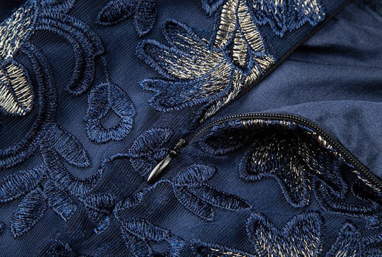 レース 刺繍 七分袖 長袖 ワンピース パーティードレス 結婚式 二次会 披露宴 パーティー デート 女子会 食事会 卒業式 謝恩会 親族 お呼ばれ フォーマル 演奏会 コンサート 発表会 膝下 大きいサイズ L 2L 3L 4L 5L ネイビー フレア 30代 40代 50代