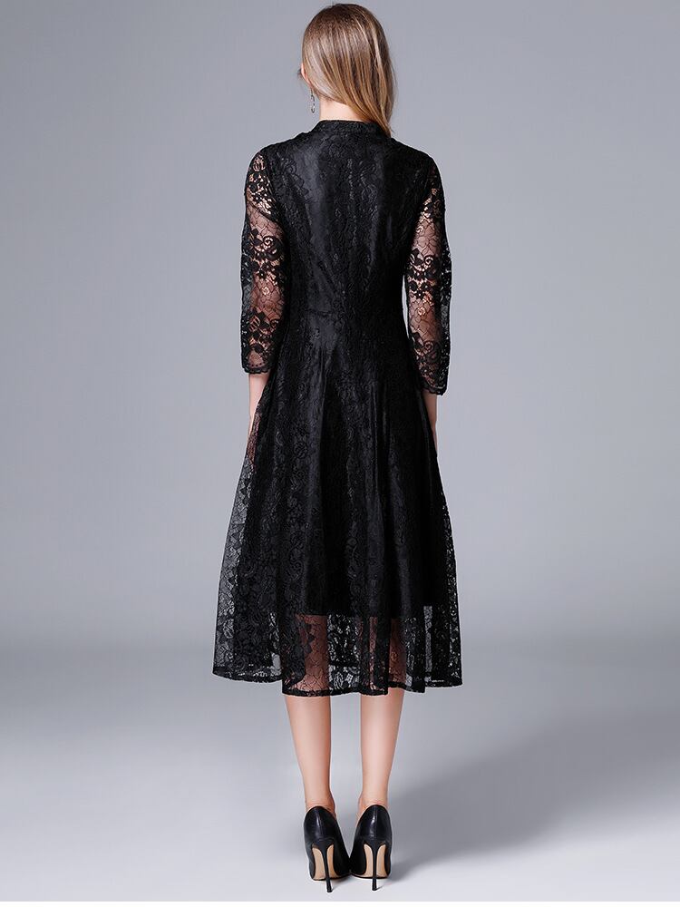 レース 刺繍 九分袖 長袖 Vネック ワンピース パーティードレス 結婚式 二次会 披露宴 パーティー デート 女子会 食事会 卒業式 謝恩会 親族 お呼ばれ フォーマル 演奏会 コンサート 発表会 膝下 大きいサイズ L 2L 3L 4L 5L 黒 フレア 20代 30代 40代