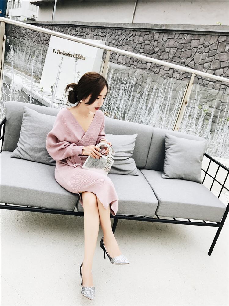 Vネック 長袖 ミディ丈 エレガントスタイル ニットワンピース カシュクール