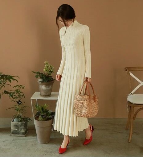 ニットプリーツが新鮮な雰囲気を与えるロングワンピース。