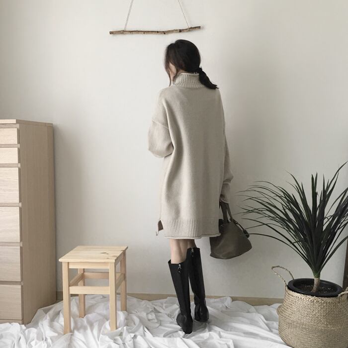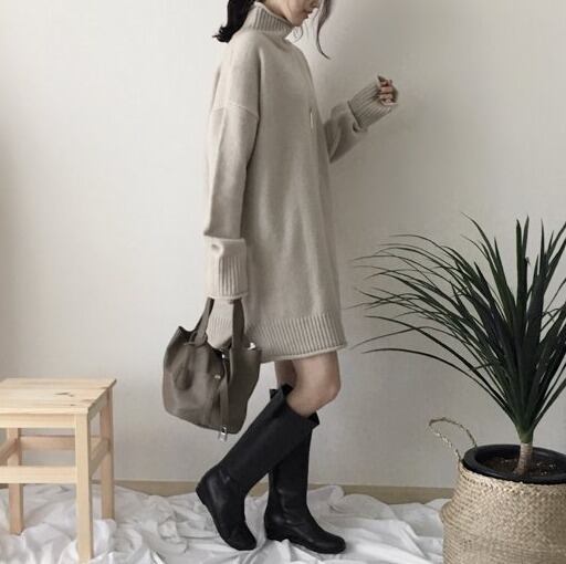 長袖 無地 ミディアム ハイネック カジュアルスタイル ニットワンピース