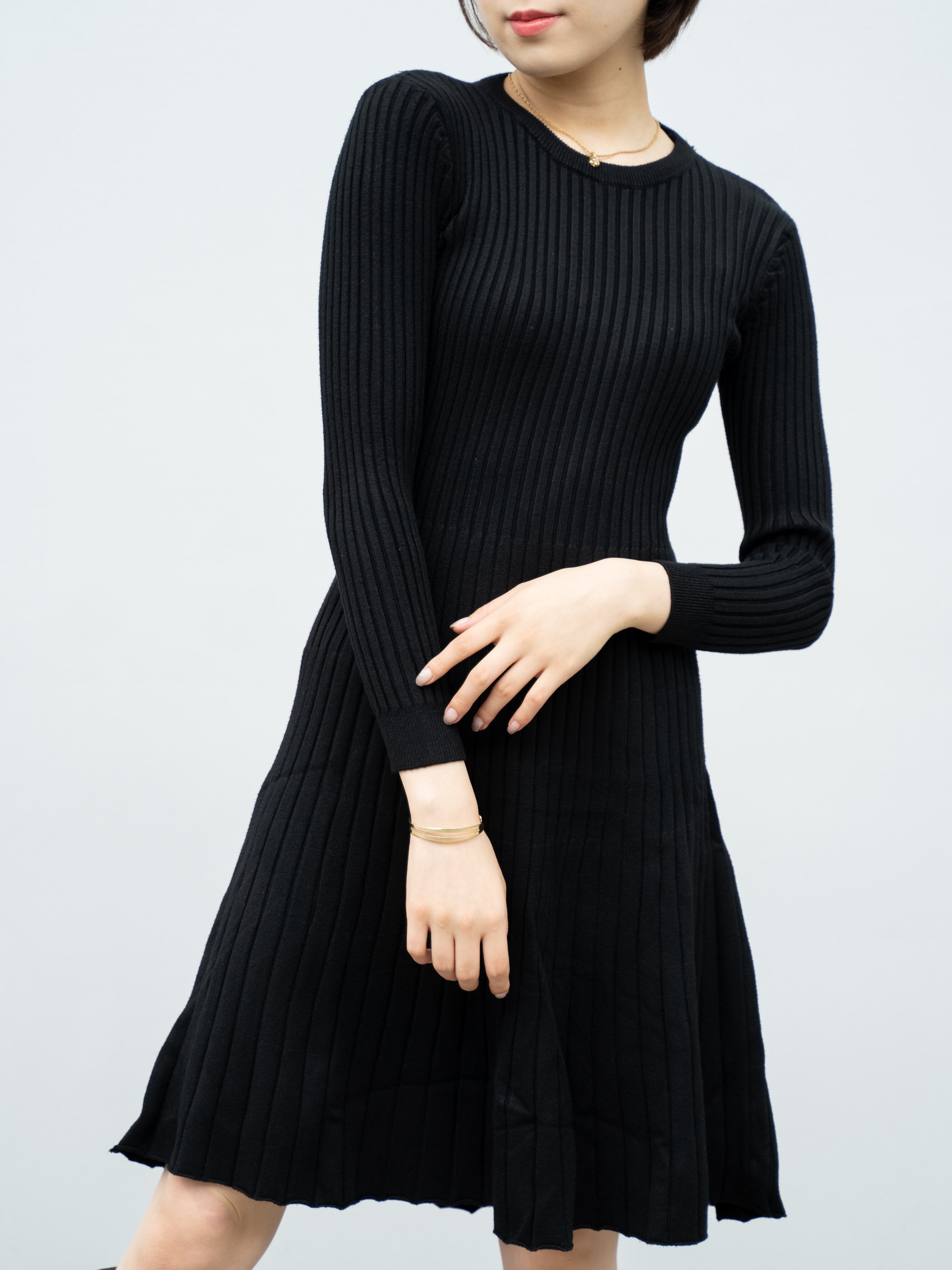 トップ部分はタイトでボトムはフレアなニットワンピース。